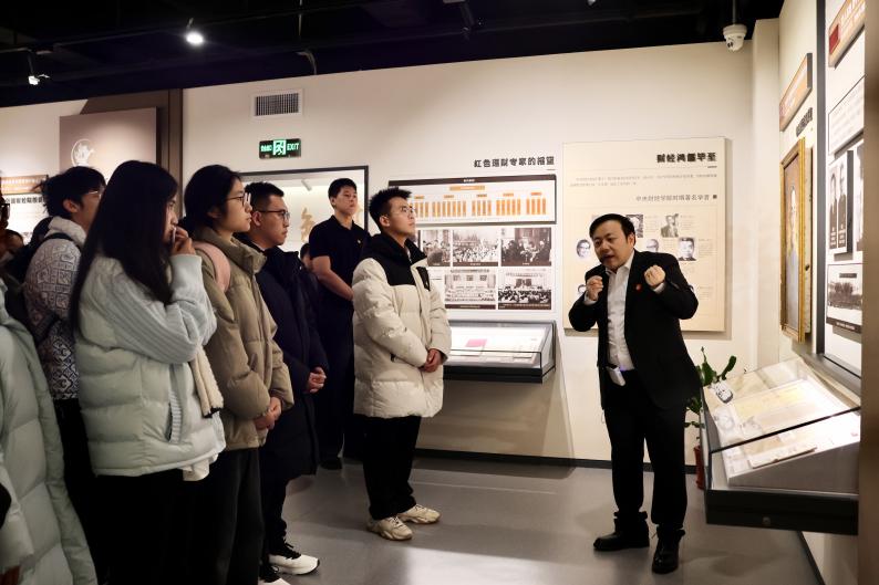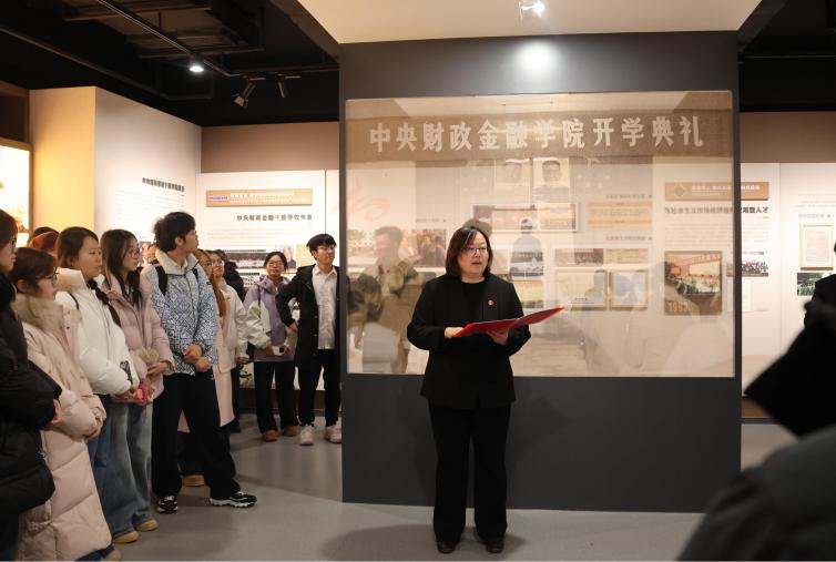 2025年12月17日下午,社会与心理学院本科生党支部在学校校史馆举行“校史馆里的思政课”主题党日活动,学校党委副书记杨莹以《传承红色校史基因 践行财经报国使命》为题为支部党员和2025级本科生讲授了一堂别开生面的沉浸式思政大课。师生们通过参观珍贵史料、聆听生动讲解、感悟奋斗历程,在鲜活的校史场景中接受了一次深刻的思想淬炼与精神洗礼。